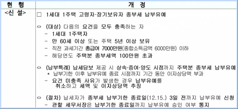 종부세 납부유예 조건은 고령자나 장기보유자가 직전 과세기간 총급여 7천만 원 이하이거나, 종합소득금액 6천만 원 이하인 경우에도 해당합니다.