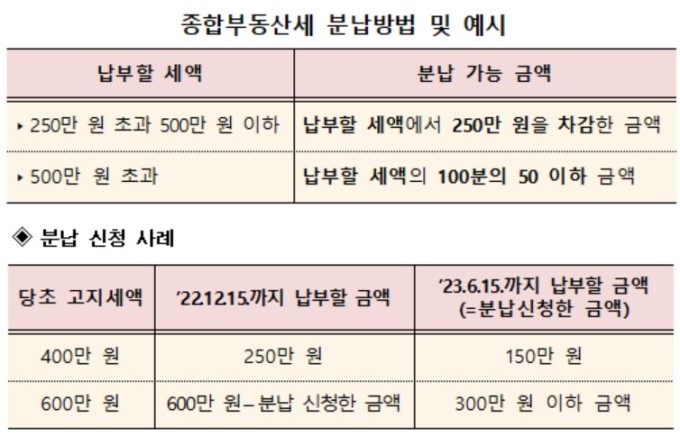 종부세액이 250만 원 초과∼500만 원 이하인 경우는, 납부할 세액에서 250만 원을 뺀 금액을 분납할 수 있습니다.